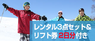 2つのスキー場で使えるスキーリフト券&レンタルスキー3点セットor スノーボード2点が【1日分】ついたスキー&スノーボードパックです♪